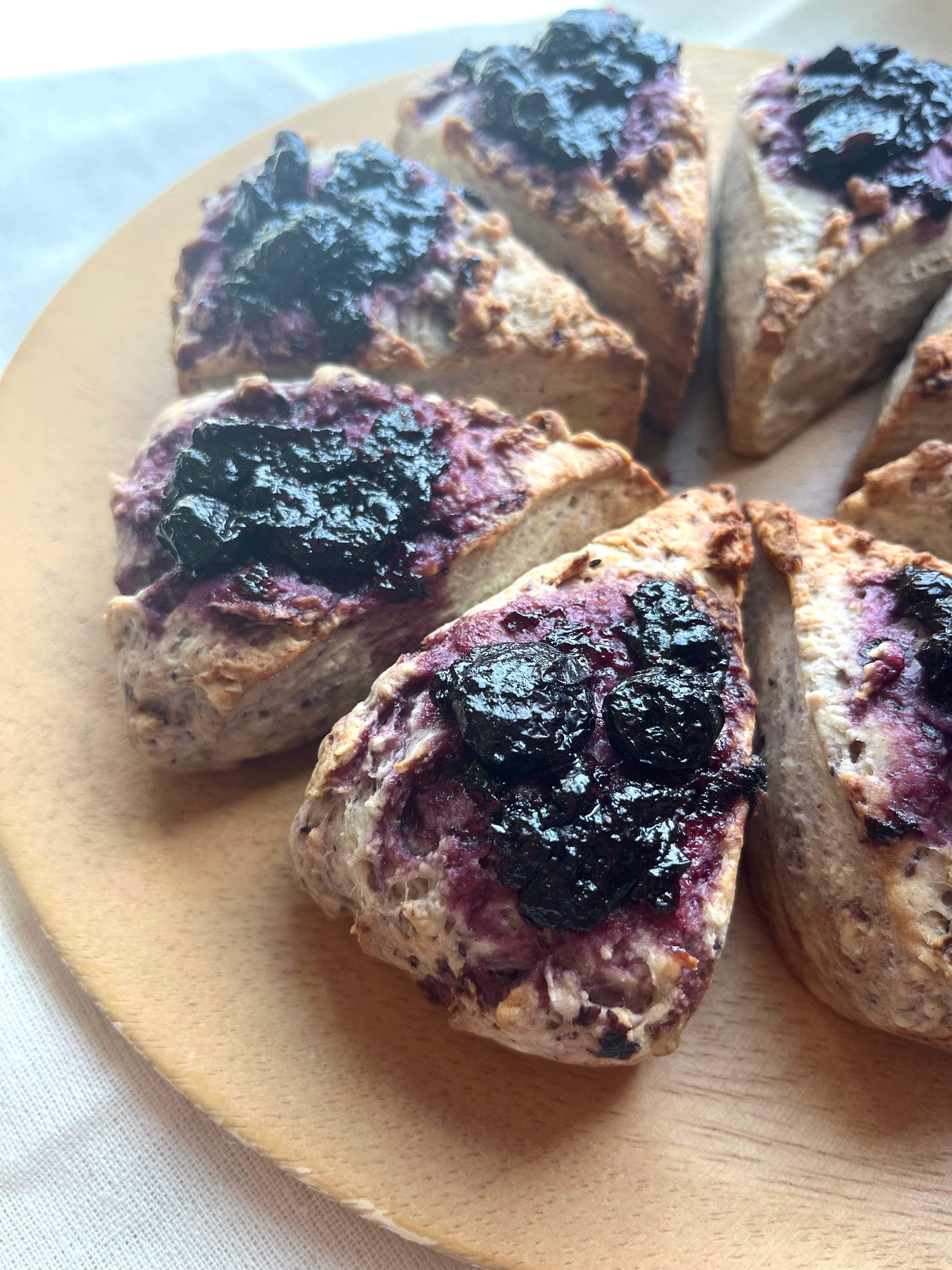 洗双糖とレモン果汁のみで炊いたブルーベリージャムは甘さ控えめに仕上げています。クリームチーズは生地に練り込んでブルーベリーとまとまり良く。マムスコーン一番人気のスコーンです。