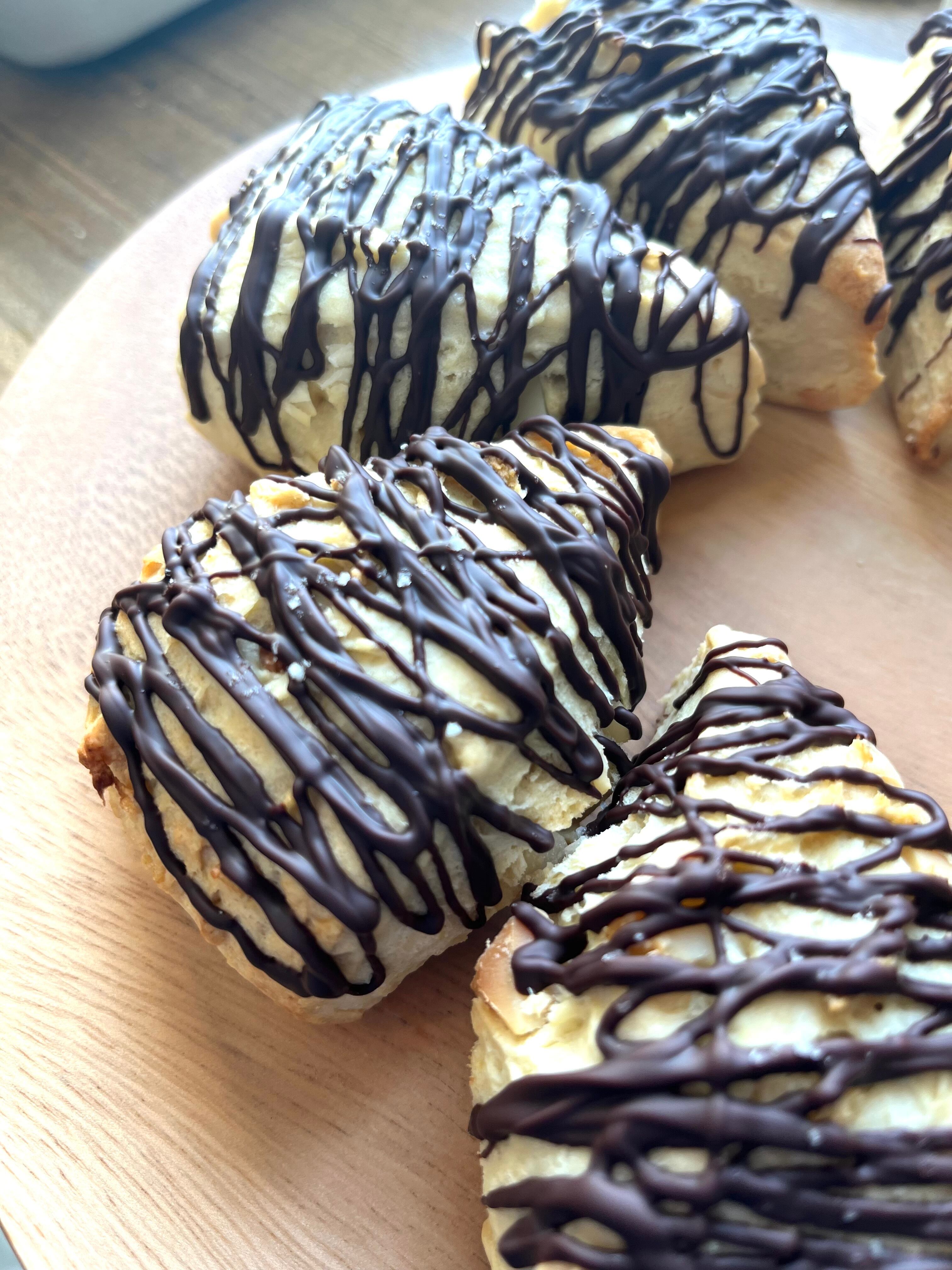プレーンな生地にマカダミアナッツとチョコレート。シンプルに個々の素材の良さを感じる組み合わせにしました。チョコレートの上にはゲランド塩を振りかけて少しアクセントを。